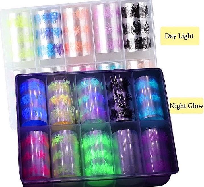 Неоновая фольга люминесцентная для дизайна ногтей. В набор для дизайна входит 10 лент неоновой фольги с разными оттенками градиента, светящихся при ультрафиолете. Размер каждой ленты 4*50см. цвета набора для маникюра голубой , розовый, фиолетовый, зеленый, черный. Переводная градиентная фольга применяется для создания дизайна и декора ногтей. Декоративный материал для создания нейл-арта.