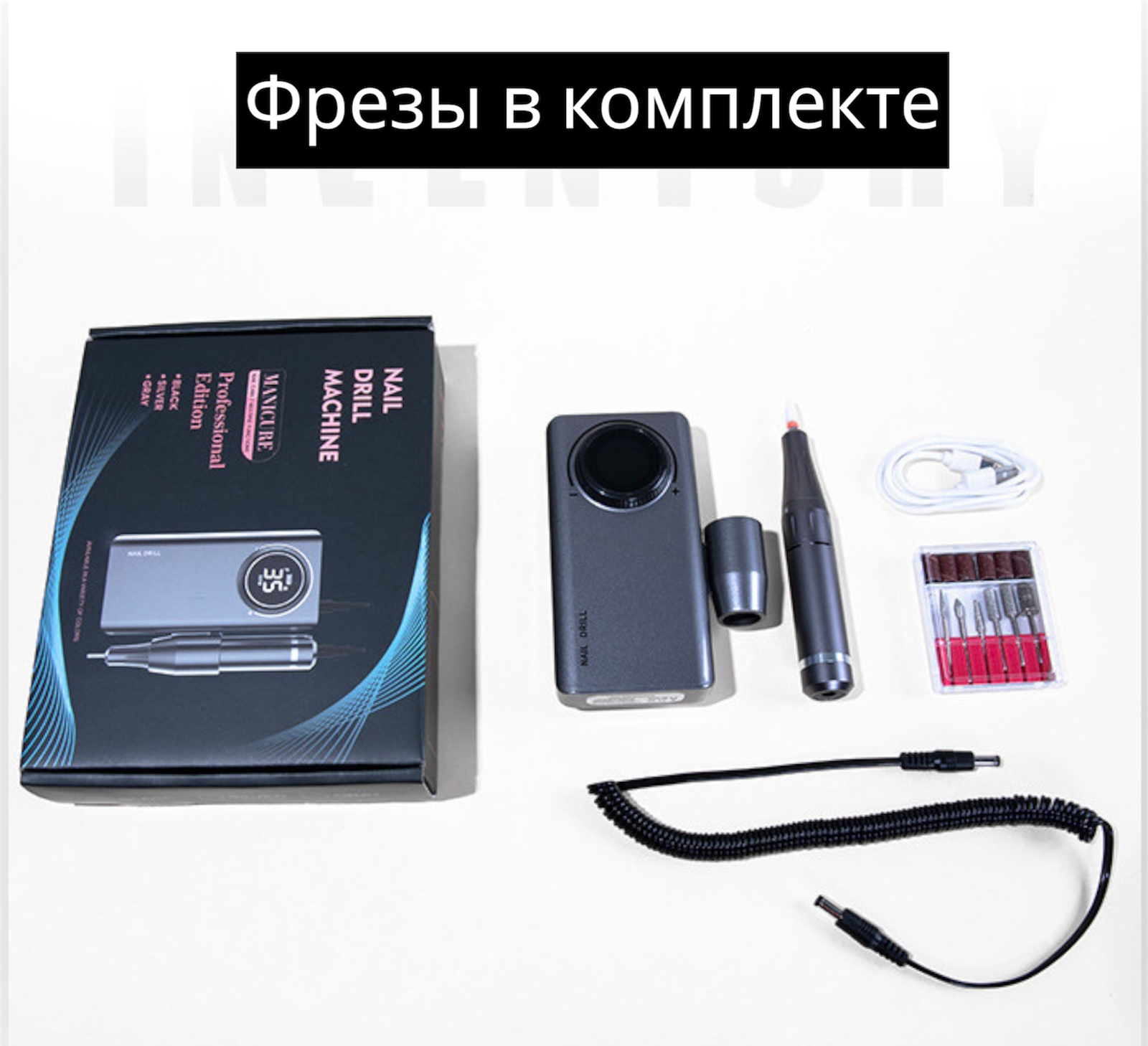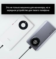 Портативный маникюрный аппарат для маникюра и для педикюра поможет вам сделать профессиональный маникюр и педикюр в салоне красоты или домашних условиях. На его эргономичном блоке расположены кнопки включения и выключения и переключения реверса. Скорость мотора машинки для маникюра составляет до 35000 оборотов в минуту, а время работы без подзарядки составляет до 12 часов. В комплекте с прибором идут 6 сменных фрез - насадок в подарок: фреза в форме диска, применяемая для полировки ногтя после опила; шлифовальная фреза в форме закругленного цилиндра, полирующая поверхность ногтя; фреза в форме конуса, которую используют для коррекции свободного края ногтя, металлическая фреза, удаляющая омертвевшую часть кожи и мозоли и керамическая фреза в форме кукурузы, которая обрабатывает ногтевую пластину, боковые валики и удаляет сухую часть кутикулы. Также в комплектацию прибора входит usb - провод для зарядки. Также данная машинка для маникюра и для педикюра может использоваться как зарядное устройство ( power Bank ) для вашего телефона. Автоматическая машинка обладает следующими функциями: полировка ногтей, маникюр, педикюр и пилинг. Электронная пилочка прекрасно подходит для снятия нарощенных ногтей, мягкой коррекции формы ногтей после наращивания, обработки пяток и стоп, удаления кутикулы. Косметичекое beauty - оборудование можно использовать и для женского, и для мужского ухода за ногтями. Электрическая пилка с реверсом заменит вам большой набор маникюрных и педикюрных инструментов. Такая бытовая техника поможет вам сделать красивый дизайн и получить эффект гладких пяточек, как после посещения аппаратного педикюра в салоне красоты. Мощная беспроводная электропилка - это отличное средство для отшелушивания ороговевшей кожи на ногах и выпиливания нарощенных ногтей. Электромашина с набором фрезер подойдет для ухода не только женщинам, но и мужчинам, ее удобно использовать дома и брать с собой в поездки и путешествия, она не занимает много места. Материалы, из которых сделаны косметологические аксессуары безопасны для здоровья. После использования все принадлежности необходимо чистить. Набор электроинструментов для маникюра прекрасно подойдет для начинающих мастеров. Вы можете собрать подарочный набор для ухода за кожей и ногтями, добавить туда косметику и мини - аппарат для маникюра и подарить жене, сестре, бабушке, маме, подруге или коллеге. Это будет отличный подарок на Новый год, Рождество, день рождения, 8 марта или любой другой праздник.