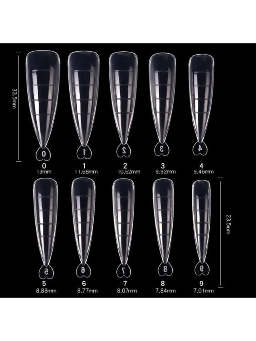 Большой ассортимент позволит каждому мастеру подобрать наиболее удобный ему вариант форм. Формы помогают создать искусственный ноготь с идеальным изгибом. Разметка и указание длины планируемого свободного края помогут выполнить желаемые по ширине и длине ногти.