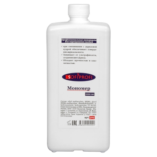 Жидкость, которая при смешивании с акриловой пудрой превращает ее в кремообразную массу и обеспечивает последующее отвердение акрила на ногте. Имеет в своем составе вещества, предохраняющие акрил от воздействия ультрафиолета, что позволяет надолго сохранить цвет акрила. Работает со всеми акриловыми пудрами. Обладает хорошей эластичностью и прочностью. Расфасован в самый выгодный по цене и большой по объему флакон - 1000 мл, который лучше всего подходит как для использования профессиональными мастерами в салонах.