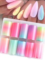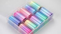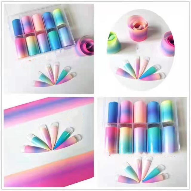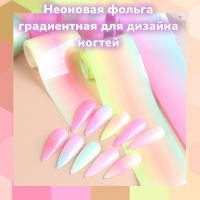 Неоновая фольга люминесцентная для дизайна ногтей. В набор для дизайна входит 10 лент неоновой фольги с разными оттенками градиента, светящихся при ультрафиолете. Размер каждой ленты 4*50см. цвета набора для маникюра голубой , розовый, фиолетовый, зеленый, черный. Переводная градиентная фольга применяется для создания дизайна и декора ногтей. Декоративный материал для создания нейл-арта.