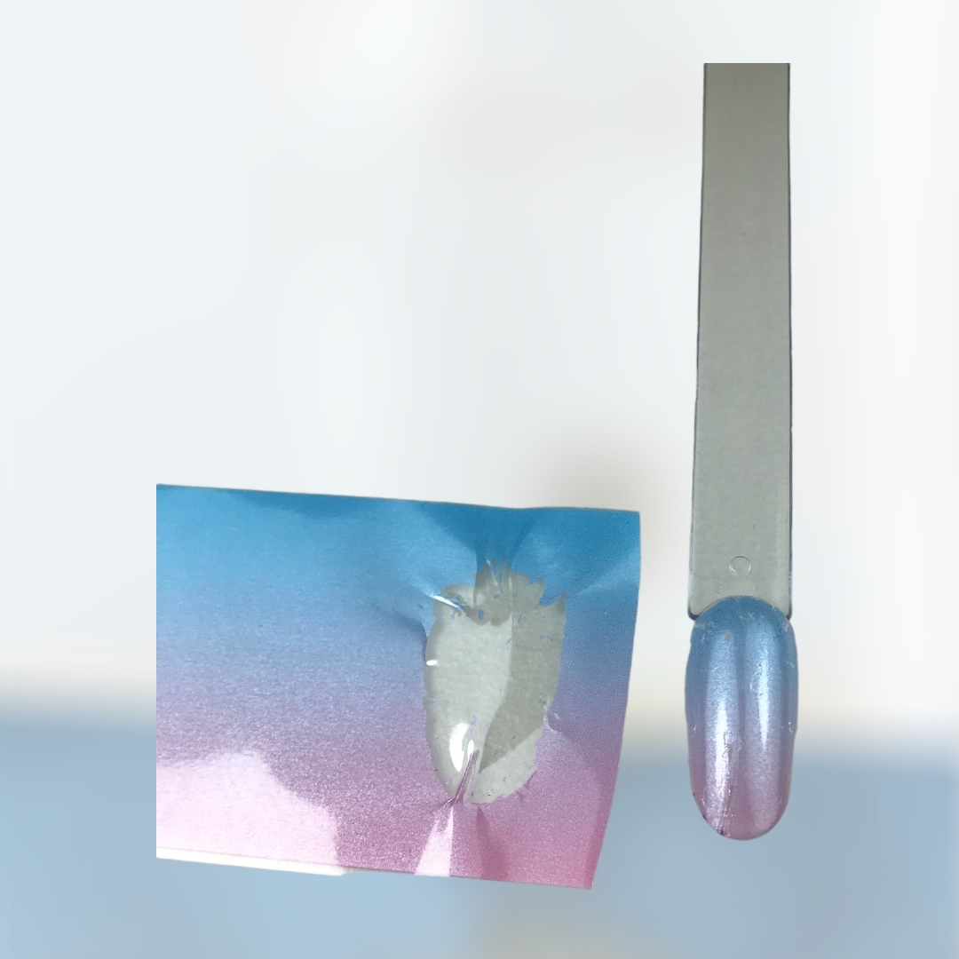 Прижимаем фольгу к поверхности ногтя пальцами или при помощи силиконовой кисти. Спустя несколько секунд убрать фольгу. Далее досушиваем в лампе до 30 секунд.